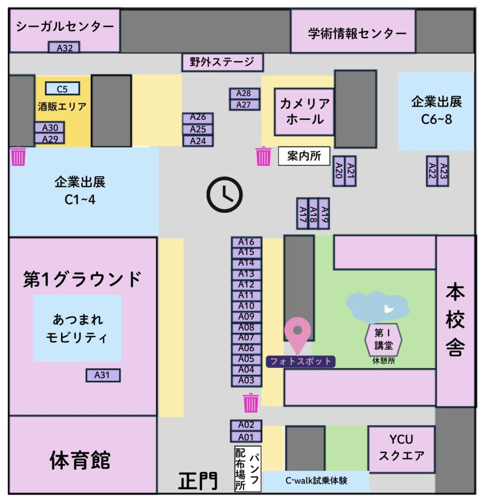 アクセス 〒236-0027 横浜市金沢区瀬戸22-2 ●京浜急行線・シーサイドライン「金沢八景駅」下車徒歩5分主な駅から京浜急行「金沢八景駅」までの所要時間 ・「横浜駅」から京浜急行快特・特急で約20分 ・「品川駅」から京浜急行快特・特急で約40分 会場マップ <全体> *出展番号(A01,C01など)は、各出展のページに記載されています <本校舎>