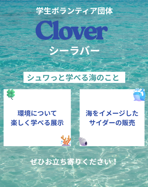 うみソーダ団体名:Clover出展場所:本校舎102ひとこと:シュワっと学べる、海のこと。 -